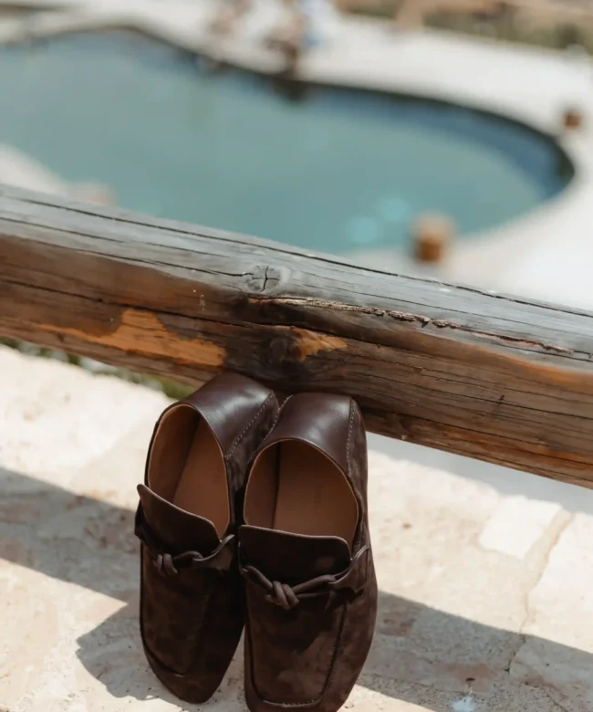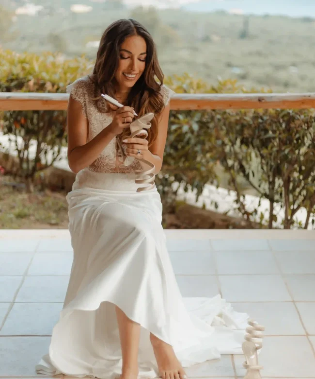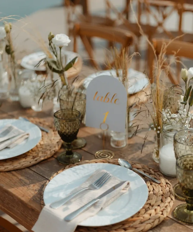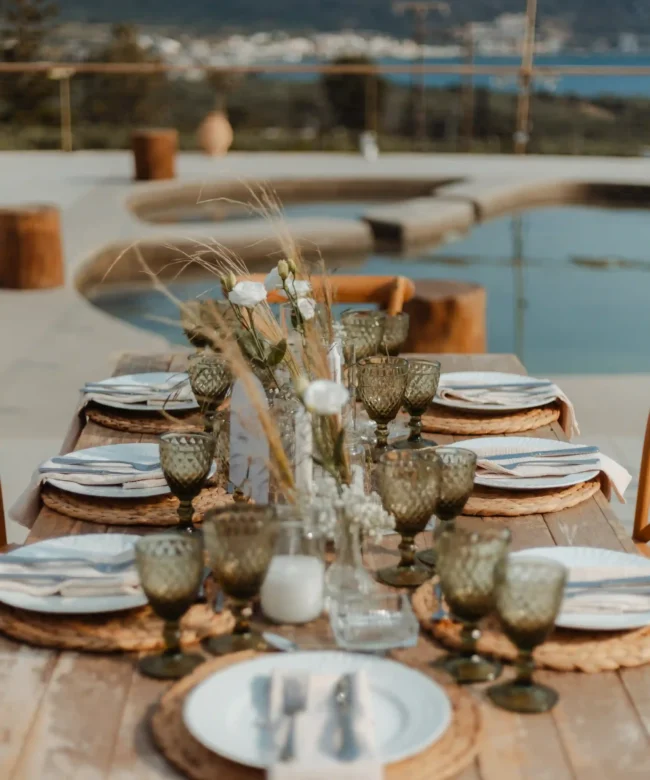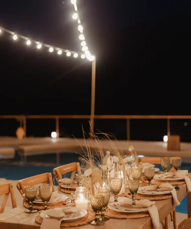 The celebration unfolded beside the pool, overlooking the serene sea and mountains. Wooden tables, rattan accents, olive-green glassware, and soft linen tones created a palette inspired by the land itself. Subtle arrangements of wheat, wildflowers, and candlelight completed the organic look, blending harmoniously with the earthy surroundings.