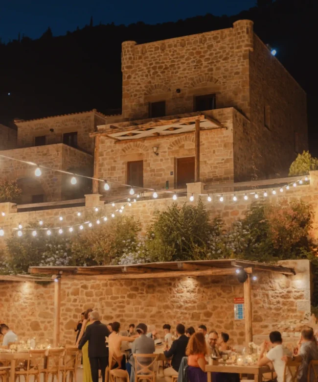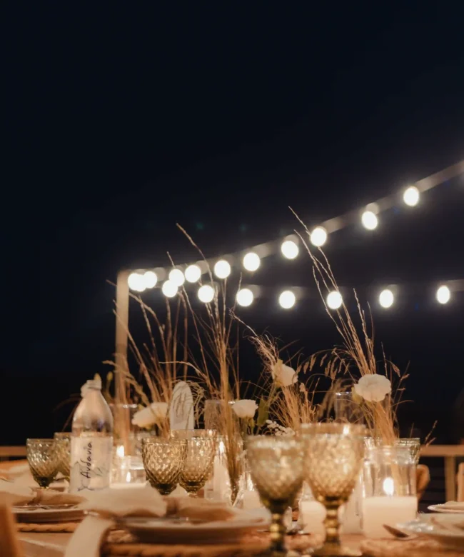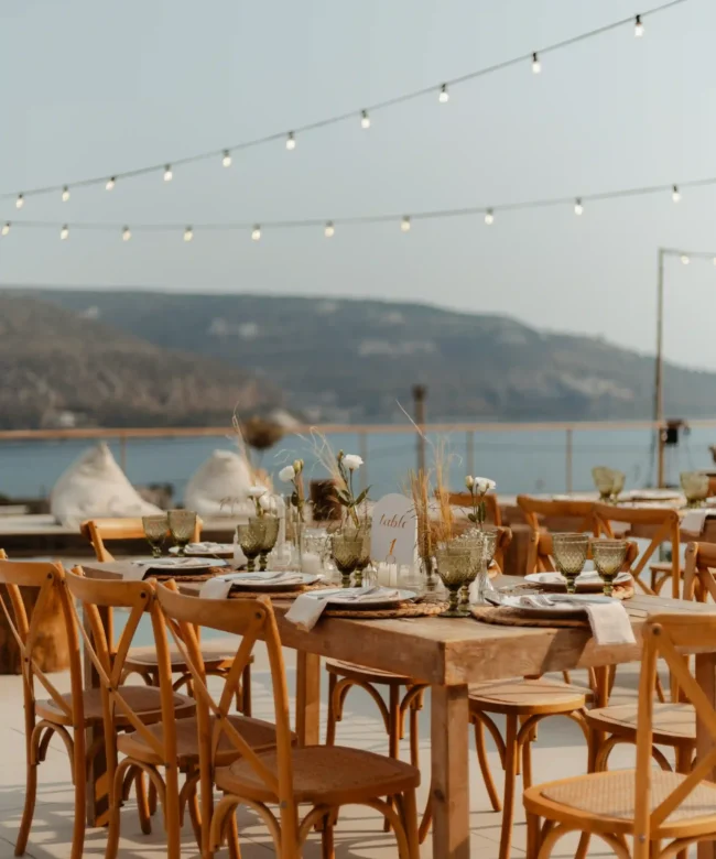 As the sun set, the space transformed under a canopy of string lights, radiating warmth and intimacy. Guests gathered around the tables, sharing laughter, stories, and a sense of connection that reflected the simple luxury of the Greek countryside.