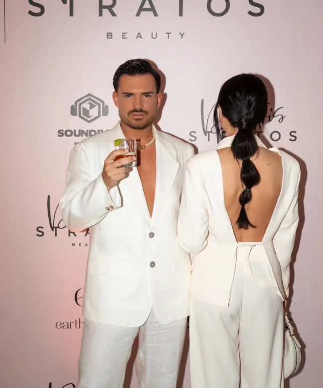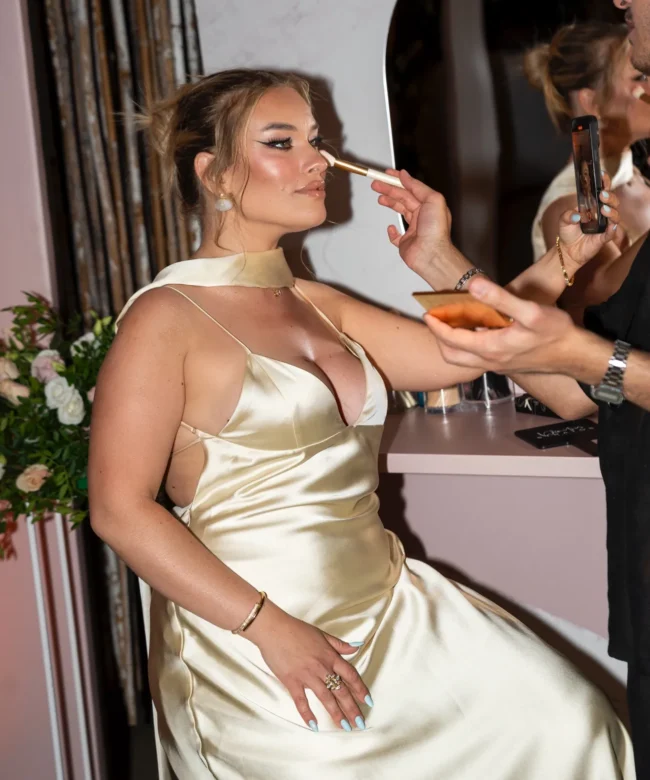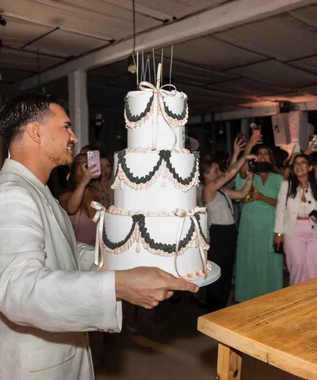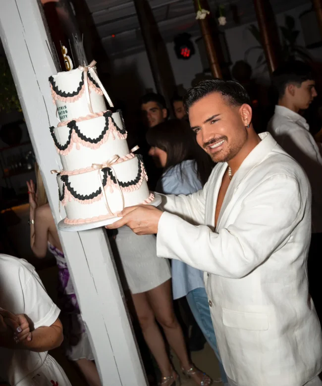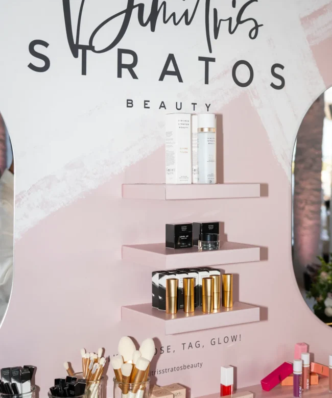 A custom pink installation became the centerpiece of the evening, complemented by a three-tier cake and delicate gift bags filled with curated beauty products.